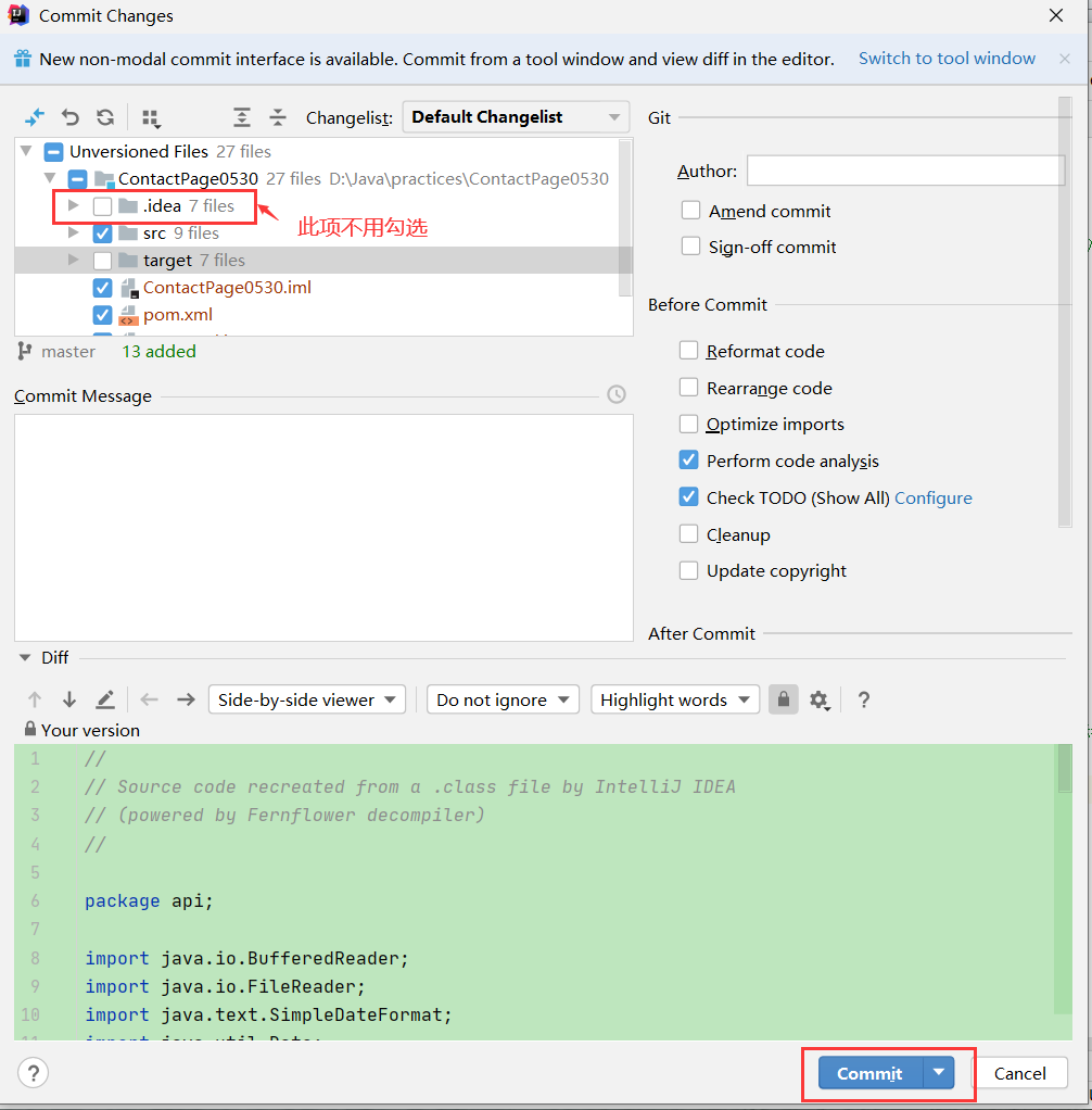 勾选要提交的代码,其中.idea不要勾选。