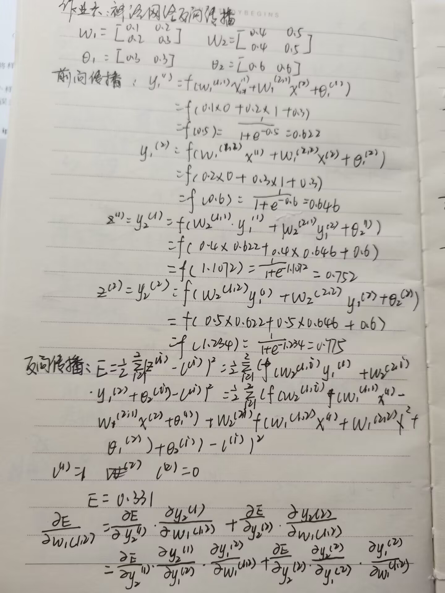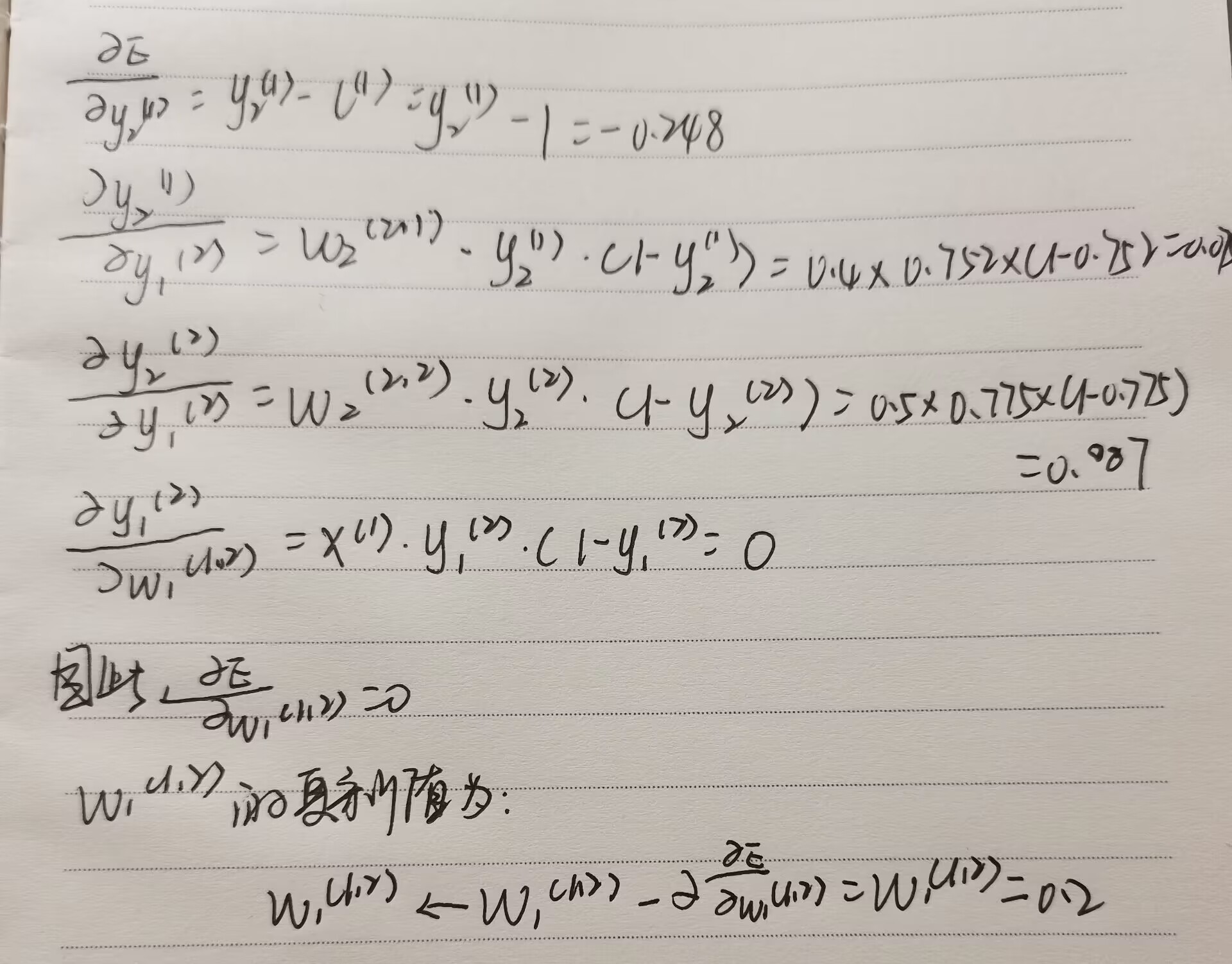 1. 根据上题中的神经网络结构和参数、数据,请计算反向传播过程中W(1,2)1W1(1,2)的更新过程。