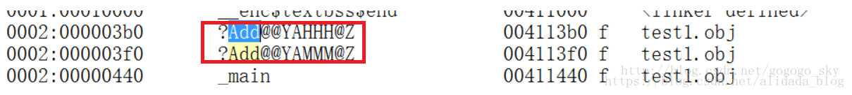 ‘?’表示名称开始,‘?’后边是函数名“@@YA”表示参数表开始,后边的3个字符分别表示返回值类型,两个参数类型。“@Z”表示名称结束。