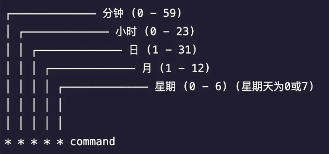 minute hour day-of-month month-of-year day-of-week commands 00-59 00-23 01-31 01-12 0-6 (0 is sunday)