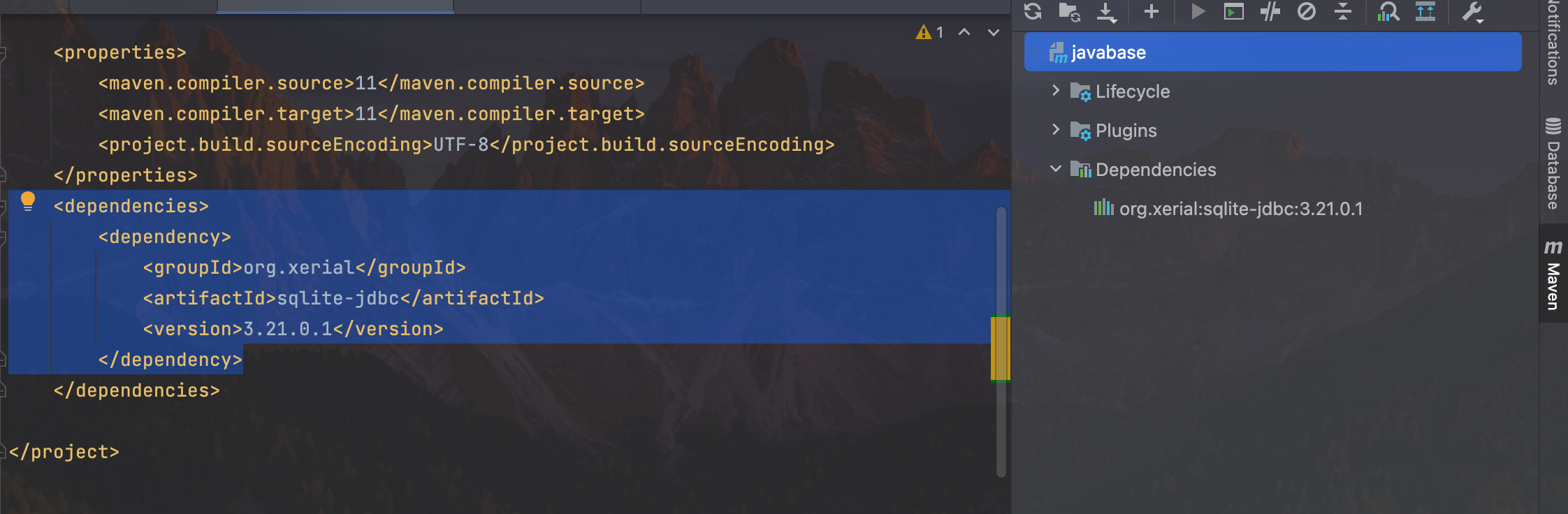 同理,连接SQLite需要Sqlite的驱动程序,这里使用另外一种方式。在Java项目的pom.xml文件中添加驱动的依赖,让IDEA自己下载驱动。