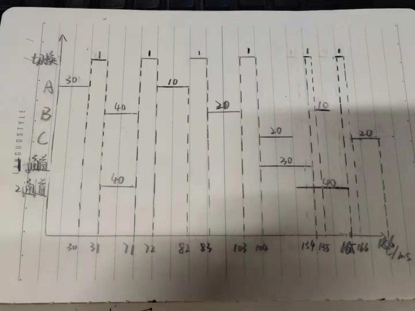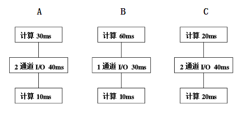 在内存中有三道进程并按ABC的顺序运行,其计算与IO操作时间如下图所示,如果每次进行进程切换时间为1ms,画出各进程状态转换的时间关系图。