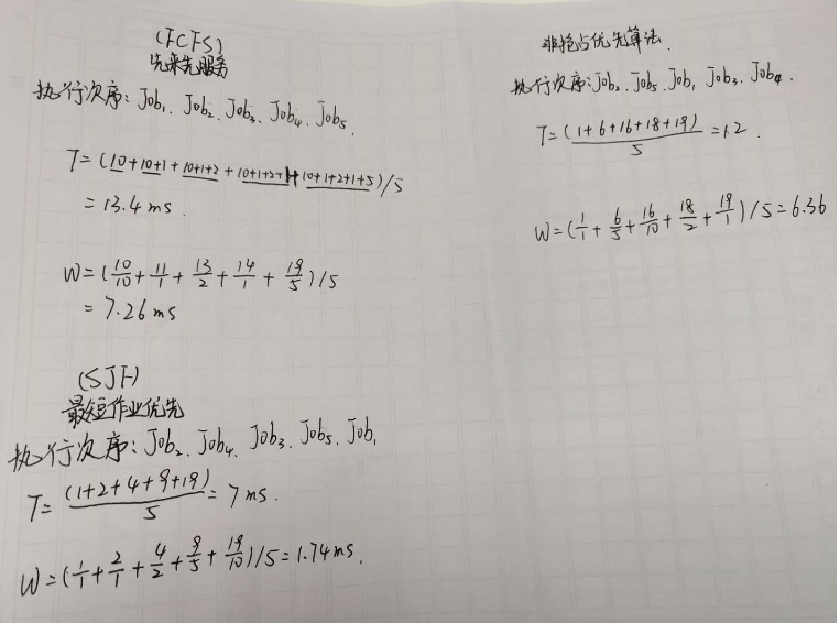 (1)采用FCFS,SJF,非抢占优先权调度算法,各作业的执行顺序。