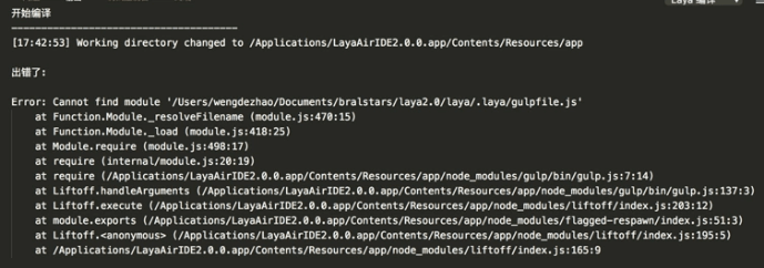 其中compile.js为开发时默认运行文件,这里如果开发者是mac系统,使用F8编译项目后,可能都会报以下错误:
