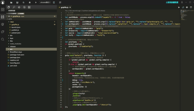 对于web前端开发,可能都会配置webpack+webpack-hot-middleware之类进行代码热更新,开发web网页的流程基本就是:修改代码 -> 自动编译 -> 自动刷新,倘若有两个屏幕,开发者不需要去刷新浏览器、输入命令重新编译等机械重复的行为。既然Laya默认使用了browserify(其实browserify这几年更新已经很慢了),这里我们可以加入gulp.watch,观察src目录源文件,每当src下文件发生修改时,自动触发编译操作,相当于开发者不需要再按F8编译。