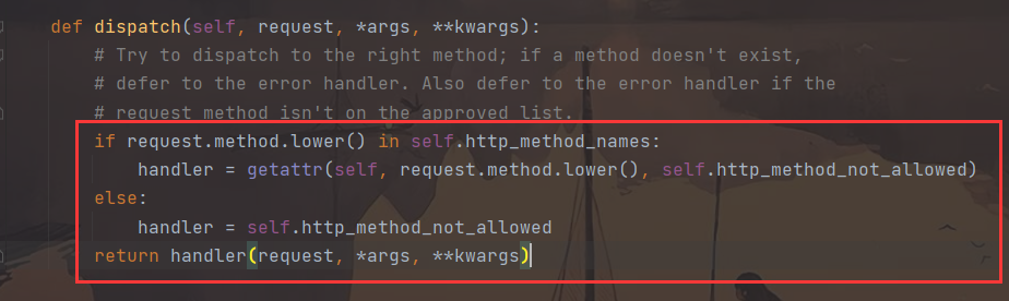 # 判断我们的self是否有名叫get的属性或方法,如果有则返回该属性的值或方法的内存地址,否则返回 self.http_method_not_allowed, 这是个啥,我们 Ctrl+点击 也来看看:
