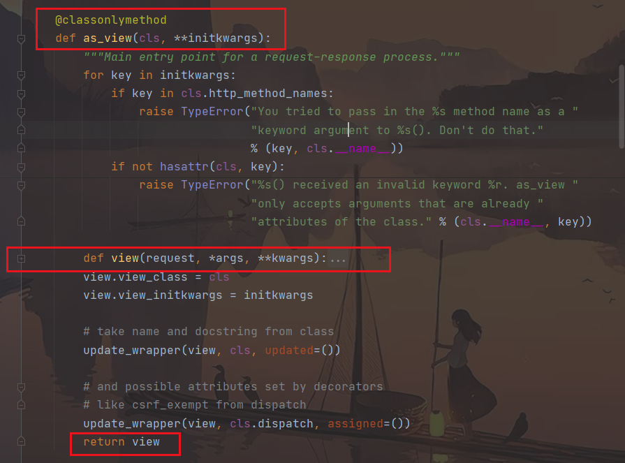 发现它是一个类方法, 查看其整体结构(只看框起来的即可, 其他的不用管), 该方法内部有一个 view 方法, 并且返回值是 view 的内存地址, 类似于闭包函数: