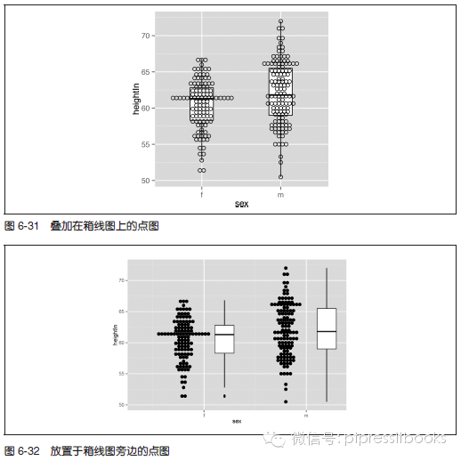 有时,我们会将点图叠加在箱线图上。这样的情况下,应该将数据点变为空心,同一时候隐去箱线图上的异常点。这是由于异常点将作为点图的一部分展示出来(见图6-31):