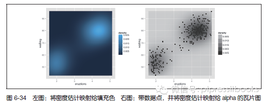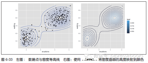 使用stat_density2d() 函数。该函数会给出一个基于数据的二维核密度预计。首先,我们绘制数据点和密度等高线图(见图6-33 左图):