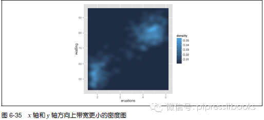 与一维密度预计一样,能够对预计的带宽进行控制。传递一个指定x 和y 带宽的向量到h,这个參数会被传递给直接生成密度预计的函数kde2d()。本例中(见图6-35),我们将在x 轴和y 轴方向使用一个更小的带宽,以使得密度预计对数据的拟合程度更高(可能会有过度拟合):