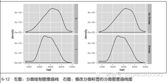 分面画图时,各分面相应的y 轴标度是同样的。当各组数据包括的样本数目不同一时候,可能会难以比較各组数据的分布形状。我们能够看看依照race 对出生体重进行分组并分面画图的结果(见图6-5 左图):