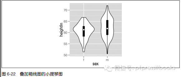 小提琴图也是核密度预计,但画图时对核密度曲线取了镜像以使形状对称。传统画法中,小提琴图中间叠加了一个较窄的箱线图,同一时候,用一个白圆圈表示中位数,如图6-22 所看到的。另外,通过设置outlier.colour=NA 能够隐去箱线图中的异常点。