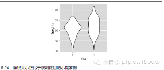 默认情况下,系统会对小提琴图进行标准化以使得各组数据相应的图的面积一样(假设trim=TRUE,对数据进行标准化时会包含尾部数据)。假设不想使各组数据相应的图的面积一样,能够通过设置scale="count" 使得图的面积与每组观測值数目成正比(见图6-24)。本例中,女性组数据比男性组数据略少,所以,f 组的小提琴图看起来略窄: