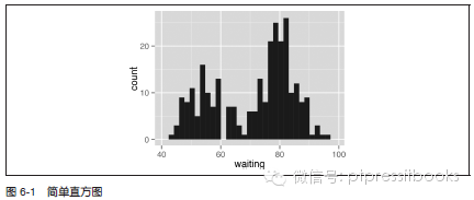 geom_histogram() 函数仅仅须要数据框的当中一列或者一个单独的数据向量作为參数。以faithful 数据集为例,该数据集包括了两列描写叙述老忠实喷泉的信息:第一列eruptions,描写叙述老忠实喷泉每次喷发的时长;第二列waiting,描写叙述两次喷发之间的间隔。以下仅以列waiting 为例: