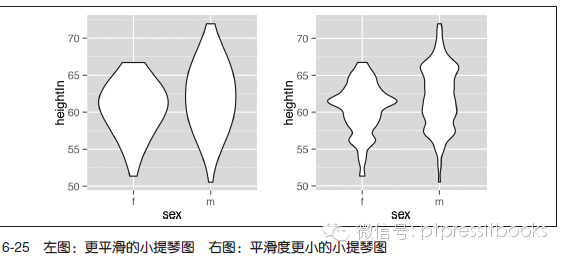 使用6.3 节中介绍的adjust 參数能够调整小提琴图的平滑程度。该參数的默认值是1;