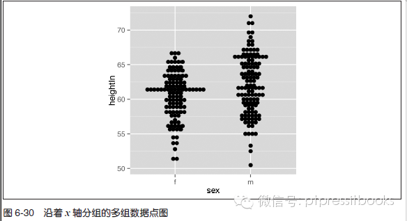 为了比較多组数据,能够通过设定binaxis="y" 将数据点沿着y 轴进行堆叠,并沿着x 轴分组。本例中 ,我们将以heightWeight 数据集为例(见图6-30):