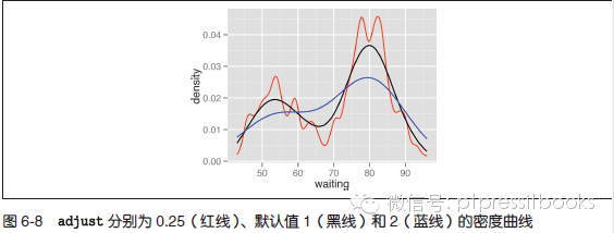 核密度曲线是基于样本数据对整体分布做出的一个预计。曲线的光滑程度取决于核函数的带宽:带宽越大,曲线越光滑。带宽能够通过adjust 參数进行设置,其默认值为1。图6-8 演示了当adjust 更大或者更小时图形的展示效果: