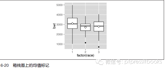 使用stat_summary() 函数。箱线图中的均值常以钻石形状来表示,所以,以下用点形23且填充色为白色的点来表示。同一时候,通过设置參数size=3 使用略大的点(见图6-20):