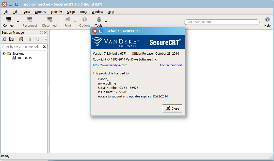 $sudo perl securecrt_linux_crack.pl /usr/bin/SecureCRT [sudo]password for root: cracksuccessful License: Name: xiaobo_l Company: www.boll.me SerialNumber: 03-61-166978 LicenseKey: ABC89D UFDU94 C94CBU 7V17SU ABTUS5 QXX9E5 PF12H6 R62SHC IssueDate: 12-22-2013