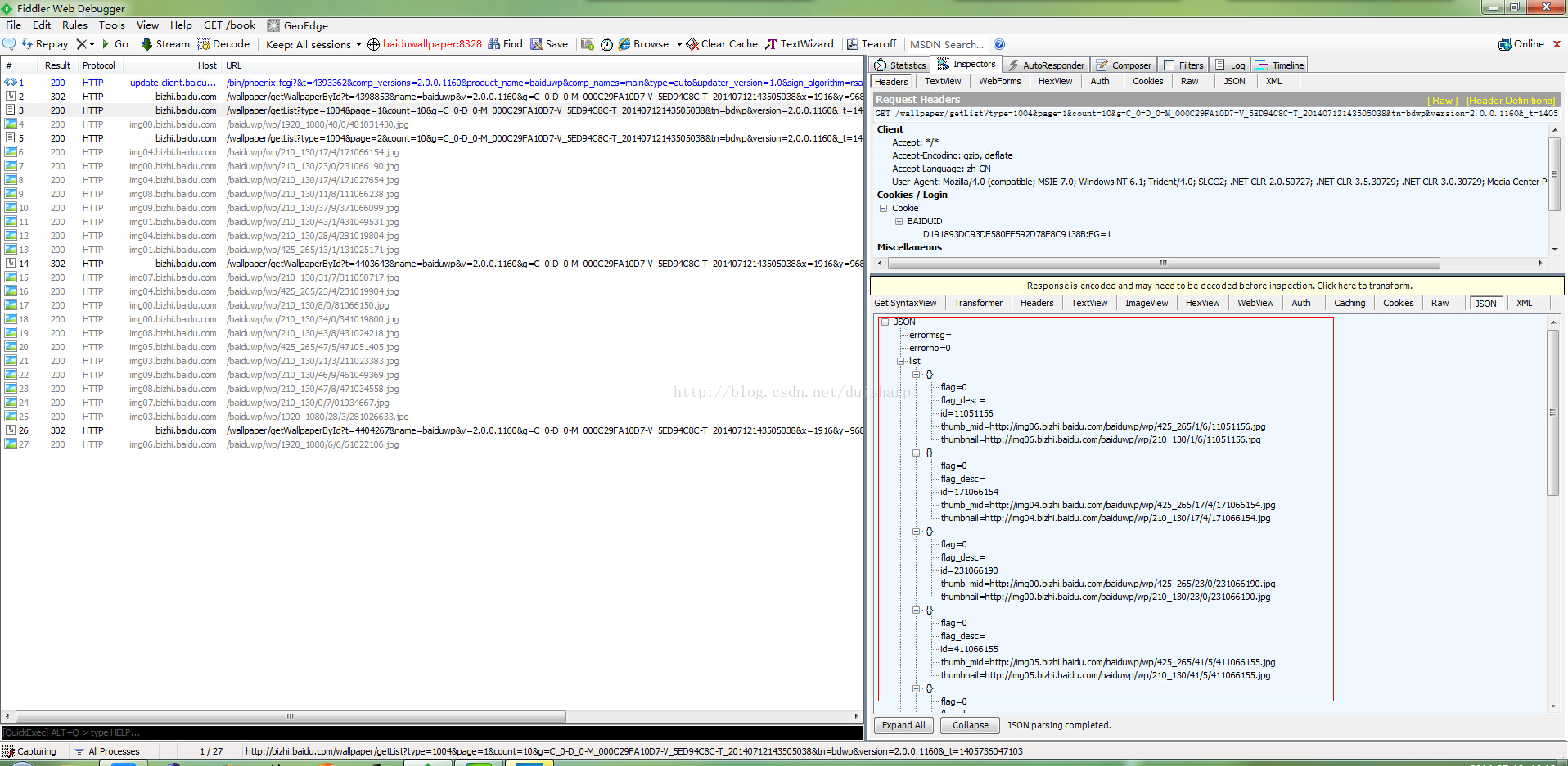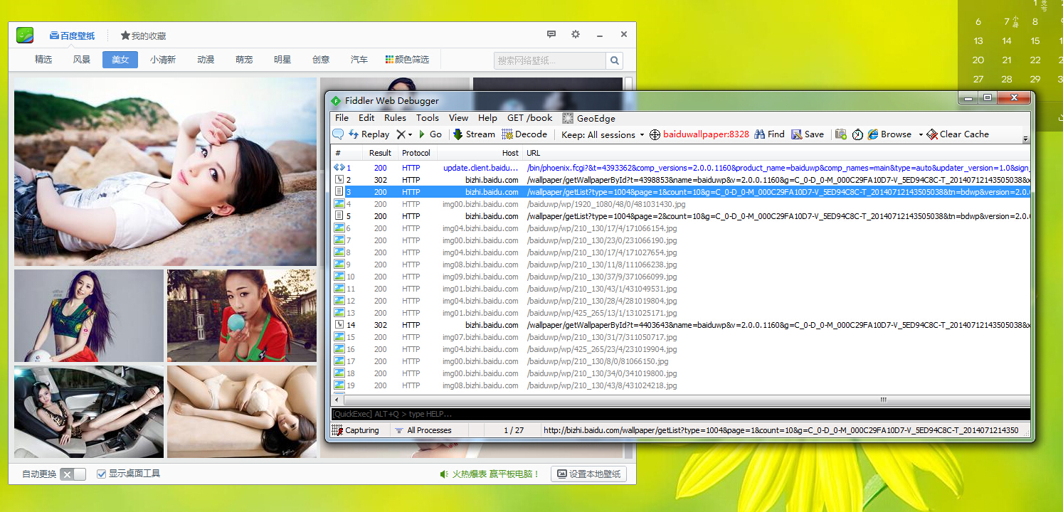 首先安装打开百度壁纸,使用Fiddler2来跟踪其数据获取的接口API。截图例如以下: