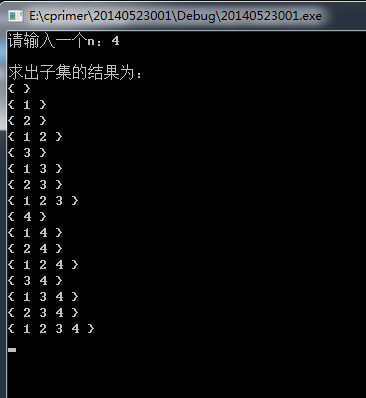 #include <iostream> using namespace std; int _tmain(int argc, _TCHAR* argv[]) { void showSubset(int n); int n; cout << "请输入一个n:"; cin >> n; cout << endl; cout << "求出子集的结果为:" << endl; showSubset(n); getchar(); getchar(); return 0; } void showSubset(int n) { //n += 1; int Subset[1000] = { 0 }; int i, j; cout << "{ }" << endl; while (true) { for (i = 0; i < n && Subset[i] == 1; Subset[i] = 0, i++); if (i == n) break; else { Subset[i] = 1; } cout << "{ "; for (j = 0; j < n; j++) { if (Subset[j] == 1) { cout << j+1 << " "; } } cout << "}"; cout << endl; } }