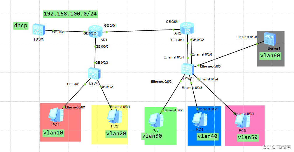 [r1-GigabitEthernet0/0/0]dhcp relay server-ip 192.168.100.2