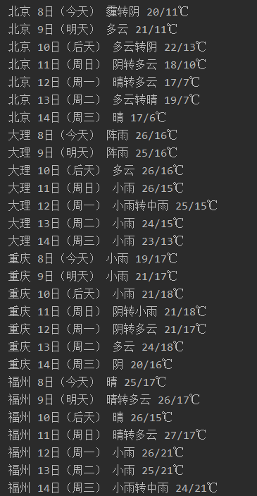 self.cityCode = {"北京": "101010100", "大理": "101290201", "重庆": "101040100", "福州": "101230101"}