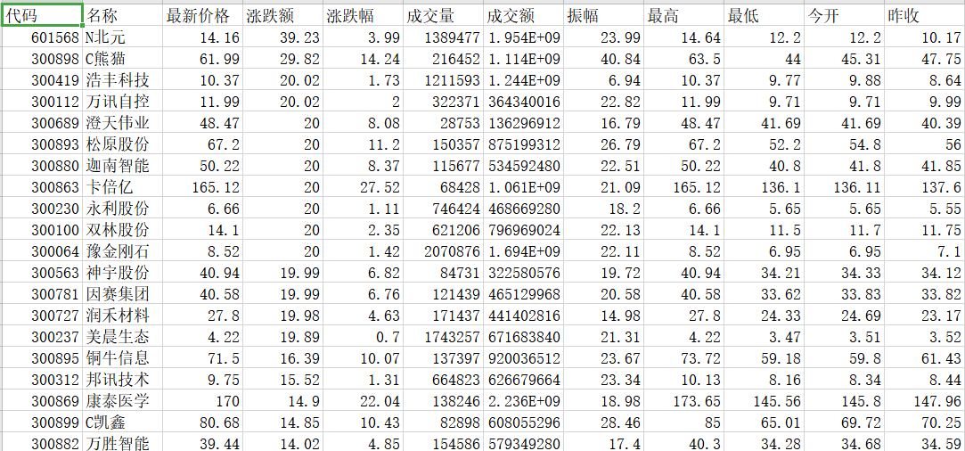 writer.writerow(["代码", "名称", "最新价格", "涨跌额", "涨跌幅", "成交量", "成交额", "振幅", "最高", "最低", "今开", "昨收"])