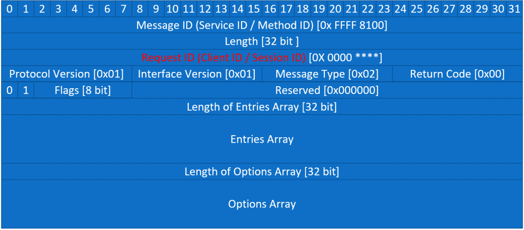 这意味着发送到多播地址的第一条SD消息具有会话ID 0x0001,并且发送给任何单播通信伙伴的第一条SD消息也具有会话ID 0x0001。