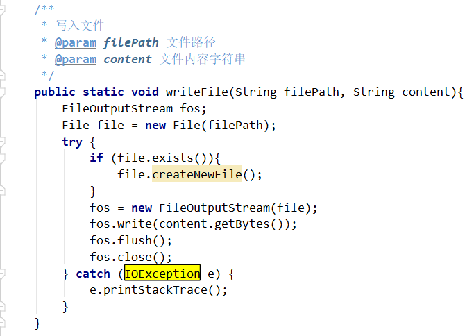 - IOException 的主要出现场景:创建文件方法 createNewFile() 失败时;文件输出流写入、刷新、关闭操作出现异常时。