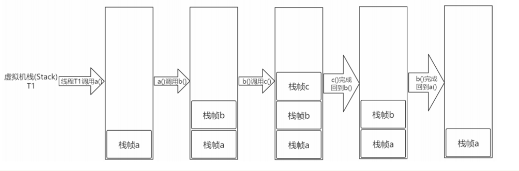 虚拟机栈:线程私有,存放当前线程中方法的调用状态,通过栈帧方式,调用一个方法压入一个栈帧,调用完成弹出一个栈帧,即先进后出