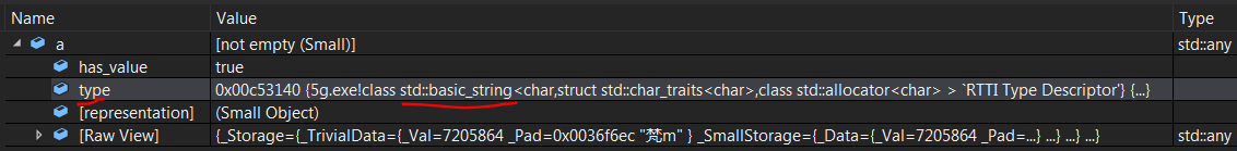 std: any是一种值类型,它能够更改其类型,同时仍然具有类型安全性。也就是说,对象可以保存任意类型的值,但是它们知道当前保存的值是哪种类型。在声明此类型的对象时,不需要指定可能的类型。