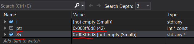 还可以为std::any对象的地址调用std::any_cast。在这种情况下,如果类型匹配,则强制转换返回相应的地址指针;如果不匹配,则返回nullptr:
