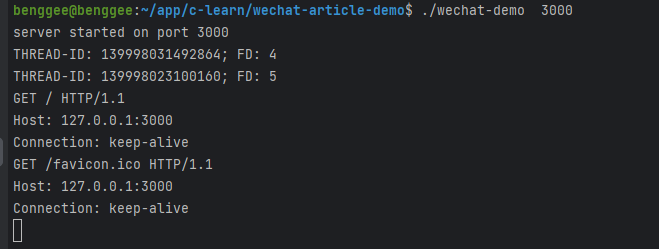 benggee@benggee:~$ gcc main.c -o wechat-demo -lpthreadbenggee@benggee:~$ ./wechat-demo 3000server started on port 3000