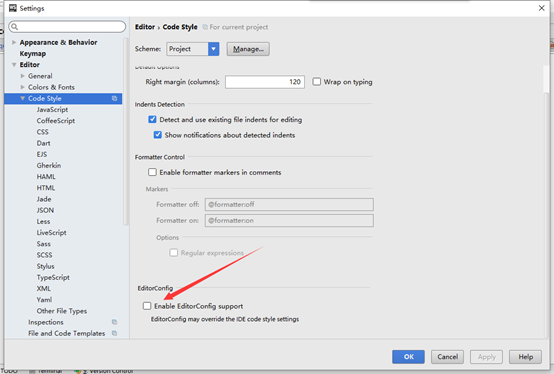 1、选择file->settings->editor->code style 去掉editorconfig->enable editorconfig support复选项,如下图所示
