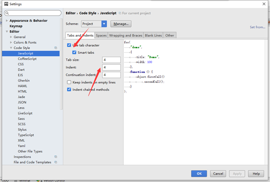 2、选择file->settings->editor->code style->javascript 勾选上use tab charator和smart tabs,并做如下图的数字设置,如下图所示设置默认缩进4个字符