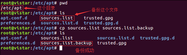 也可以直接用命令:cp /etc/apt/sources.list /etc/apt/sources.list.backup ,则不用切换目录直接备份。