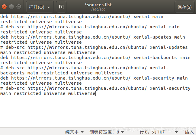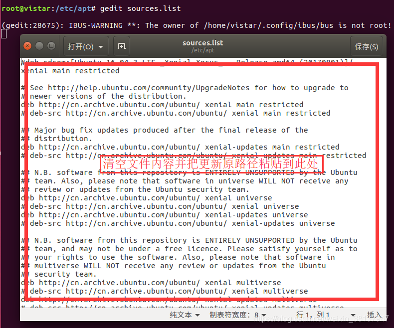 修改配置文件sources.list内容,输入命令:gedit sources.list 打开文件,把文件内容全部删除,再把更新源路径粘贴进来。
