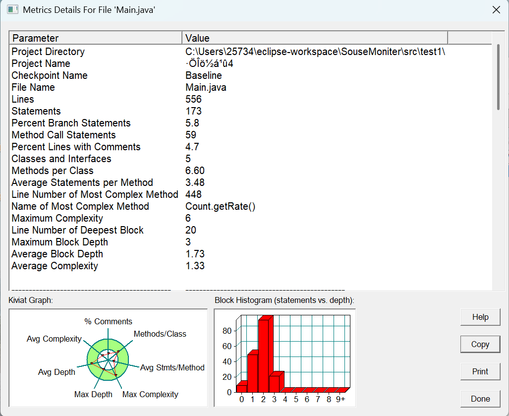 - Line Number of Most Complex Method:8 行,Name of Most Complex Method为Main.main(),Maximum Complexity是 14。说明该方法在代码中的位置以及它的复杂程度较高,可能存在较多条件判断、循环或嵌套逻辑。