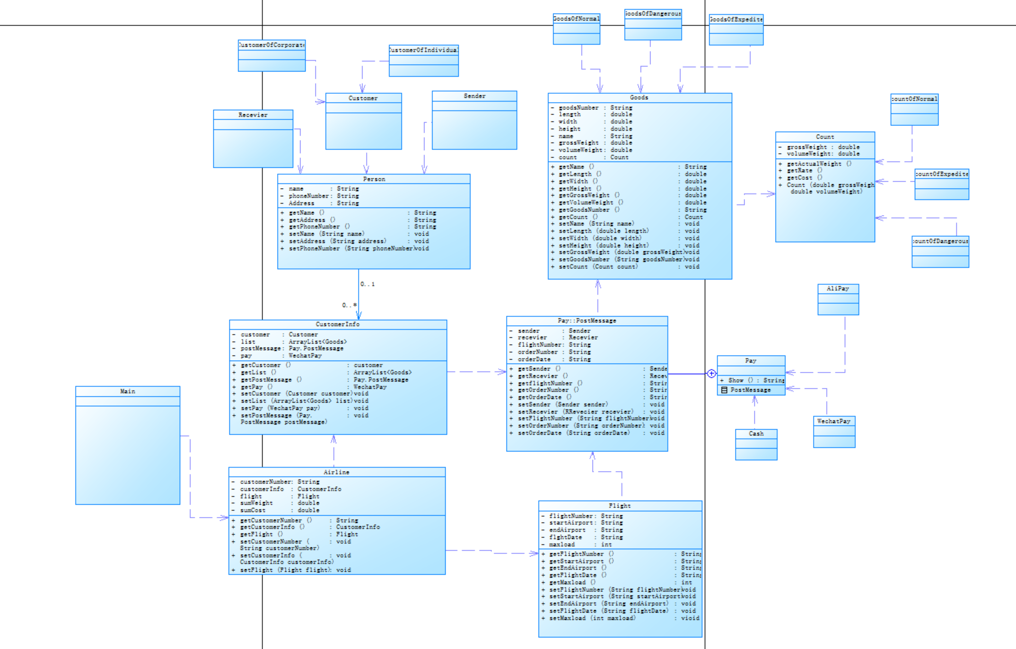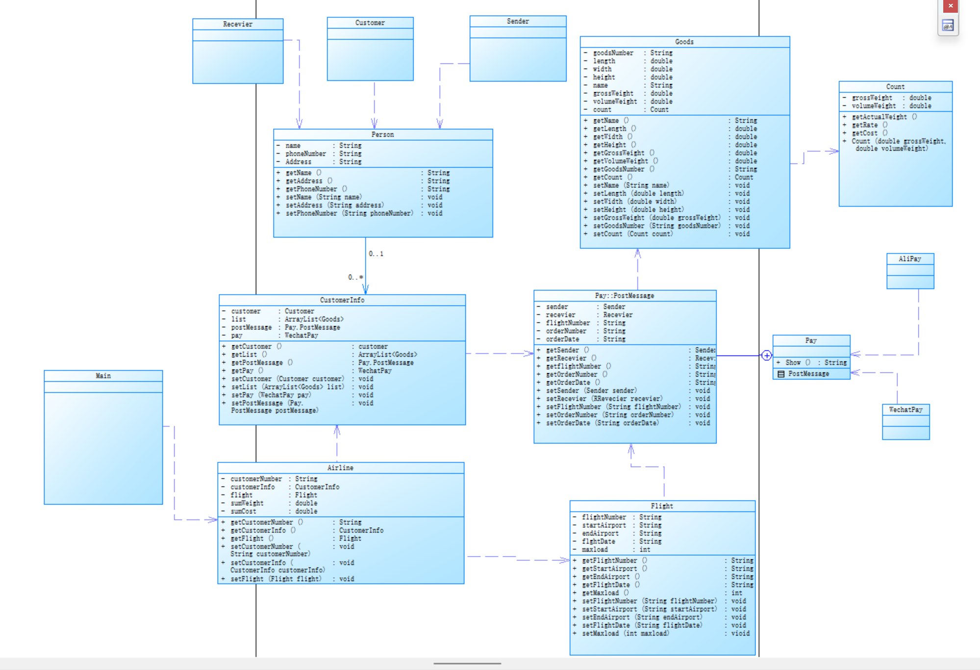 - Main 类:用于获取用户输入信息。依赖于Scanner、Iterator、ArrayList类;与Airline类、Customer类、Goods类、Pay类等存在创建实例的依赖关系。