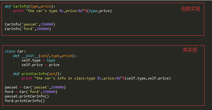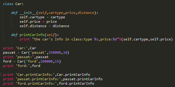 2.两个函数的参数是不同的,CarInfo方法很直接的传了cartype和price这两个参数,而在printCarInfo方法中只传递了self。这也直接导致了后面在函数中使用变量的时候也是不同的。