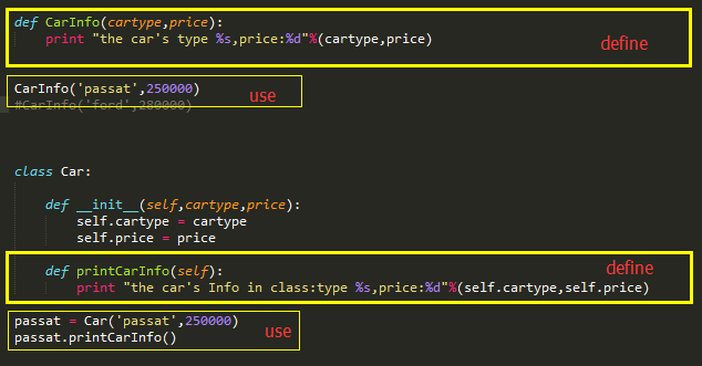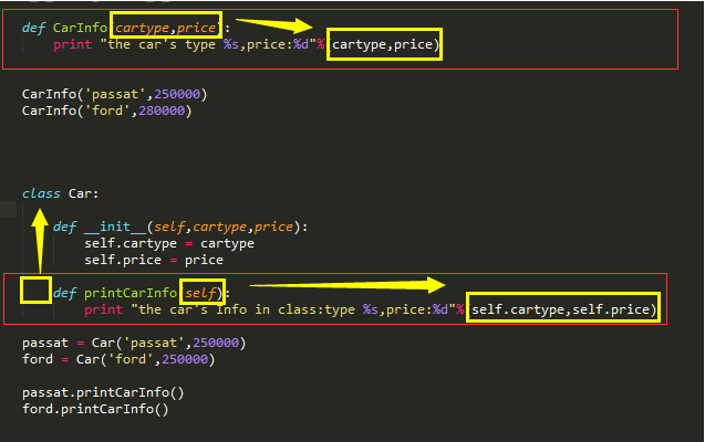 我们根据上图来比较,先来看函数的定义,从图中很明显就可以看出,CarInfo中的参数在printCarInfo方法中的换成了self,在方法的调用中,就是用self.属性吗来调用了。