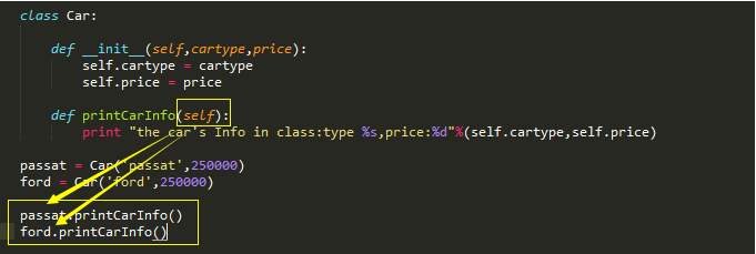 这里的self就表示对象,看上面的图,我们是怎么调用car类中的printCarInfo方法的?好像是和我们之前调用普通方法不一样了,前面加了一个passat和ford(使用了car的对象),而且后面根本就没有加参数,就可以在方法中直接打印出cartype和price两个变量的值,why?