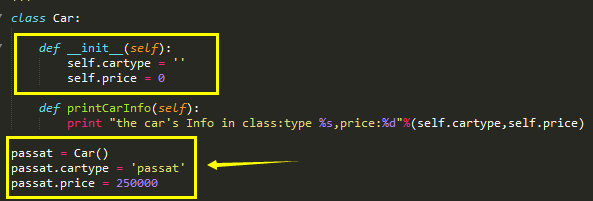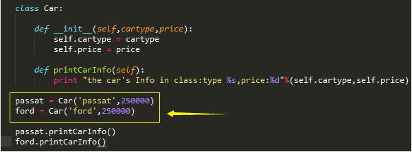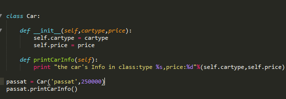 所以,当我们使用passat这个对象去调用printCarInfo这个方法的时候,其实是做了这样一步操作,printCarInfo(passat)把passat这个对象传给了printCarInfo方法,passat这个对象又包含了两个属性cartype、price,我们在python规定这样使用一个对象中的变量:passat.cartype、passat.price,不要问为什么,这是语法,你这么写python就认识,不这么写它就不认识!