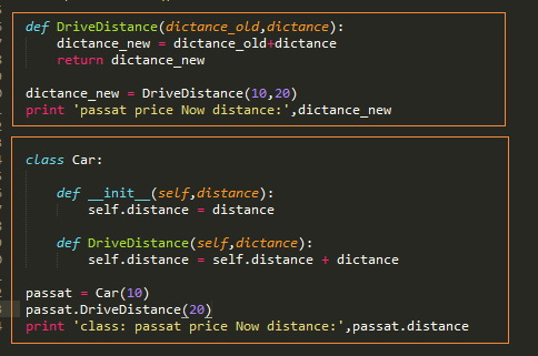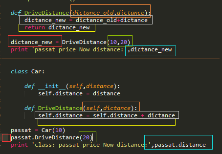 上面是函数方法实现,下面是类方法实现。先看方法的定义,我们看到橘色框框中标出了两个方法的参数不同,现在我们已经知道self是对象,在类方法中,对象是必须的参数,因为我们在之前讲到过,都是使用 对象名.方法名 调用方法,passat.DriveDistance()的意思是DriverDistance(passat),那么passat.DriverDistance(20)的意思翻译过来就是DriverDistance(passat,20),所以无论如何self参数是必须的,这个记着就行。然后我们再看函数的实现,灰框框里面的内容,是用车从前跑的距离加上新跑的距离就是总共的行驶里程,函数里的实现方法很好理解,我们现在来看看类中的实现方式,是用对象原来的dictance加上新参数的dictance,并赋值给了这个对象的dictance属性,所以我们看黄色框框里面的内容,在函数的实现中我们需要将函数的执行结果返回调用者,但是在类的实现过程中,却不需要,因为我们修改的是对象的属性,在其类方法中修改了,我们再使用的时候就是使用了修改后的值。这里首先解释了红框框中不需要返回值的现象,然后解释了蓝框框中在我们打印现在的行驶里程的时候,直接用passat.dictance就可以了。