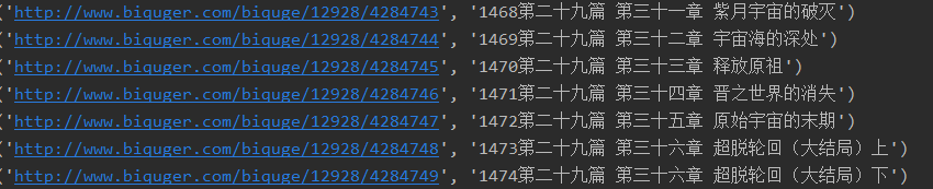 这样我们就获取到我们需要的url以及对应标题的列表了, 其中i[0] 为url, i[1] 为标题.很多人可能会有疑问, 为什么在标题前要加序号?标题是我们保存章节的文件名, 我们必须保证其有序性, 而序号就是起到这个作用.