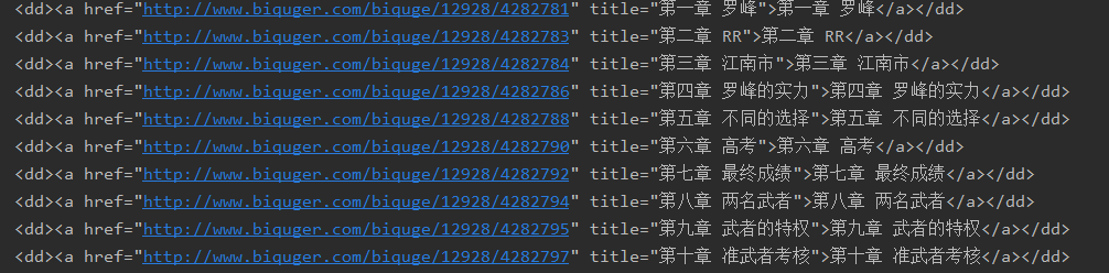 在一节中,我们学习了如果通过正则表达式来获取HTML里面指点便签的内容, 那么我今天就来看看实际的效果.在抓取小说之前, 我们需要知道小说有哪些章节,以及这些章节的顺序.