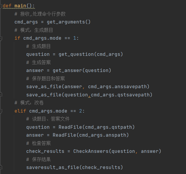 main():程序的入口函数,根据命令行参数决定执行生成题目还是阅卷操作。