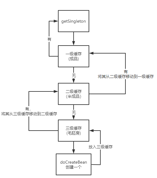 既然beanB创建好了,放到一级缓存,所以刚放进去beanA就可以完成填充属性的步骤了,接着执行完剩下的逻辑,闭环完成,最终beanA喝beanB都在一级缓存中。