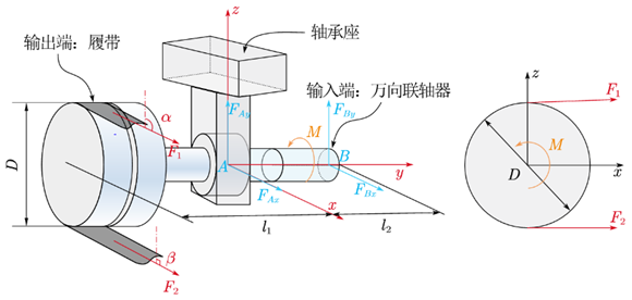 以整个轴为研究对象,轴承A处与万向联轴器B处为一对正交分力,根据静力学定理,可按空间任意力系来构建平衡方程。具体方程组如下